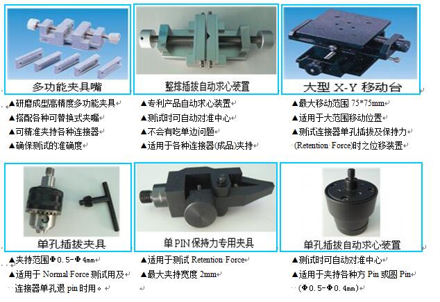 ●本机器适用于各种连接器之插入力及拔出力测试,提供各种连接器专用夹治具及搭配专用自动求心装置,将可得到完全准确之插拔力试验。