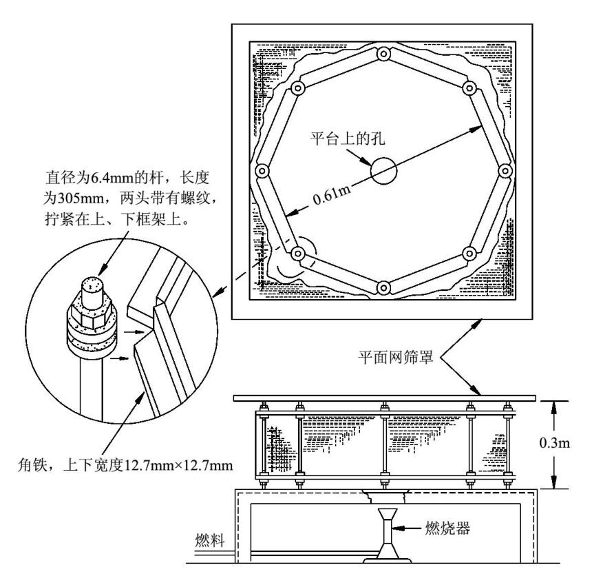 本机适用于锂电池(或电池组)耐燃性试验。在一实验平台上钻一直径为102mm的圆孔,并在圆孔上放置一钢丝网,将被测电池置于钢丝网筛上,在试样周围安装一个八角形的钢丝网,然后点燃燃烧器,对试样进行加热直至电池爆炸或电池烧毁为止,并对燃烧过程进行计时。